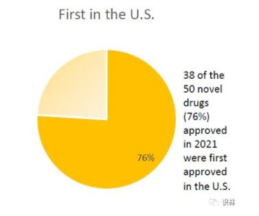 2021年批准的50个新药中有38个(76%)是先于其他任何国家在美国获得批准的。