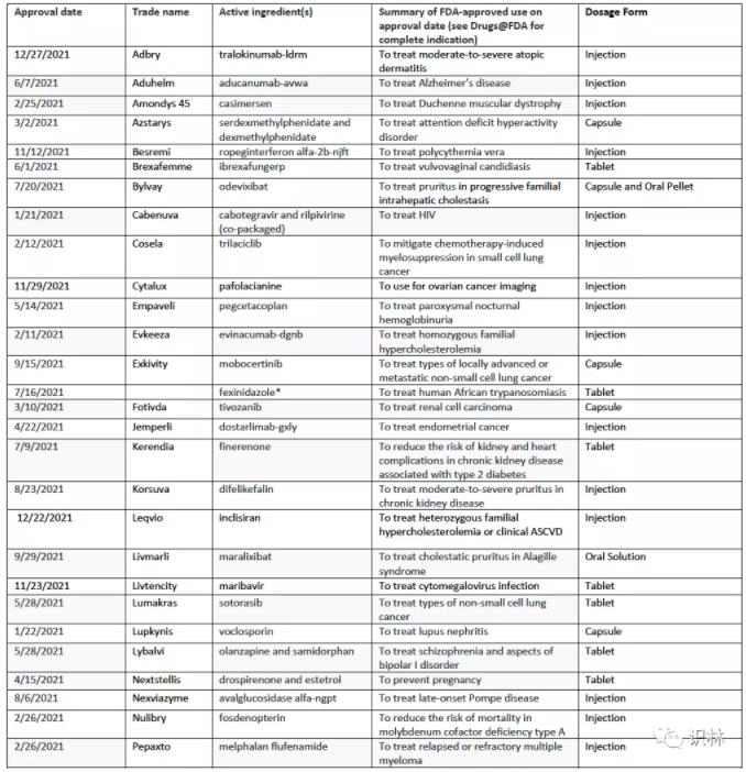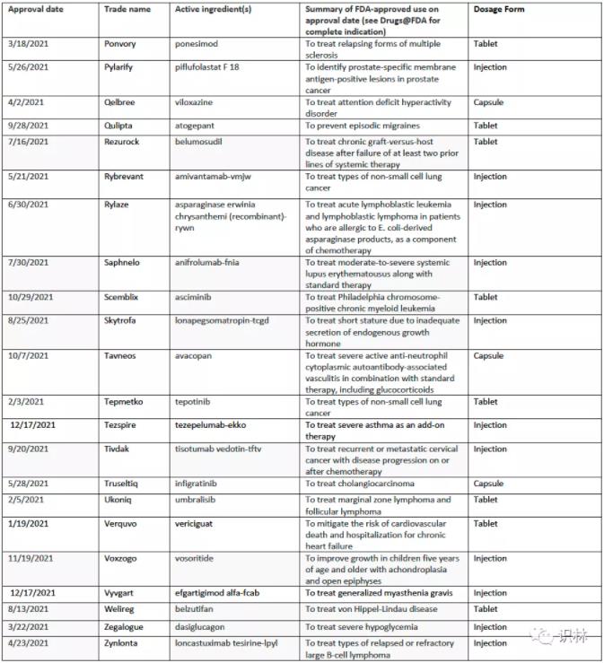 2021年首轮批准的新药有: