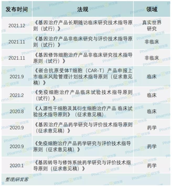 据研发客不完全统计,2020~2021年两年时间里,药监局共发布了9项有关细胞治疗的法规,囊括了药学、临床前、临床研究和上市后真实世界研究等全流程(见下表)。