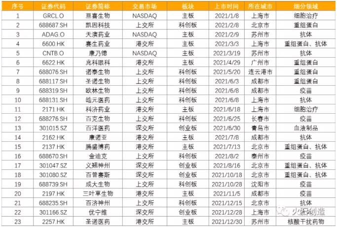 (一)上市分析2021年生物药领域有23家企业(不包括新三板),其中包括NASDAQ上市企业3家,在科创板上市企业9家,港交所上市企业6家。从细分领域来看,在重组蛋白领域和抗体领域各有8家及10家企业布局(其中4家企业同时布局重组蛋白和抗体两个领域),5家企业布局疫苗,2家企业布局细胞治疗领域,血液制品领域和核酸干扰药物领域各有1家企业布局。从地域分布来看,北京(5家)、上海(5家)、成都(4家)是2021年新上市企业数量最多的三个城市,苏州3家企业上市,广州、泰州等6个城市各有1家企业上市。