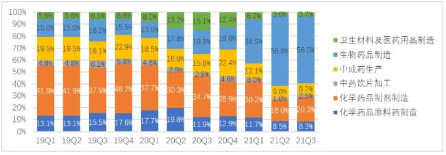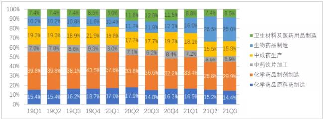 图3:2019Q1-2021Q3医药工业六大子行业对医药工业的利润贡献占比
