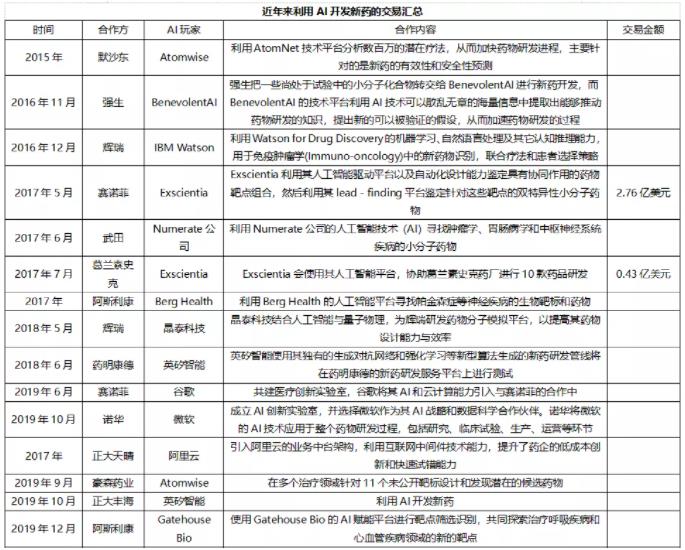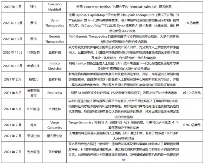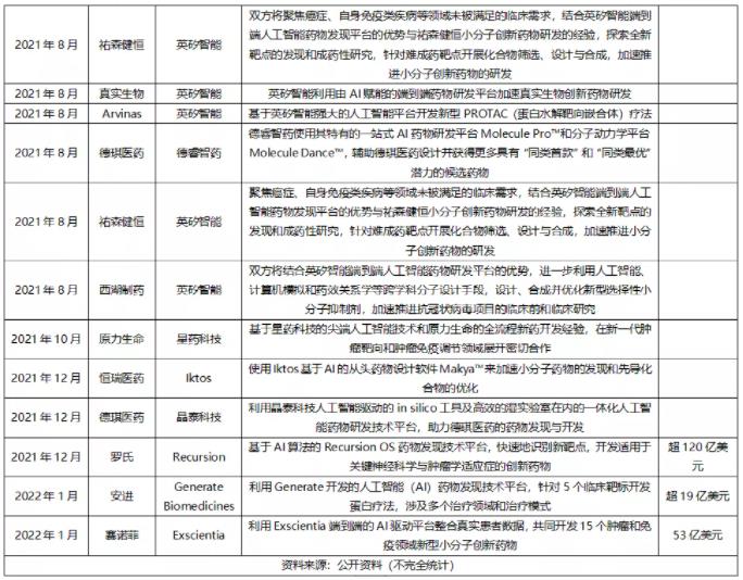 近年来,AI在医药领域的应用蓬勃发展,全球多家围绕AI研发新药达成合作,详见下表。