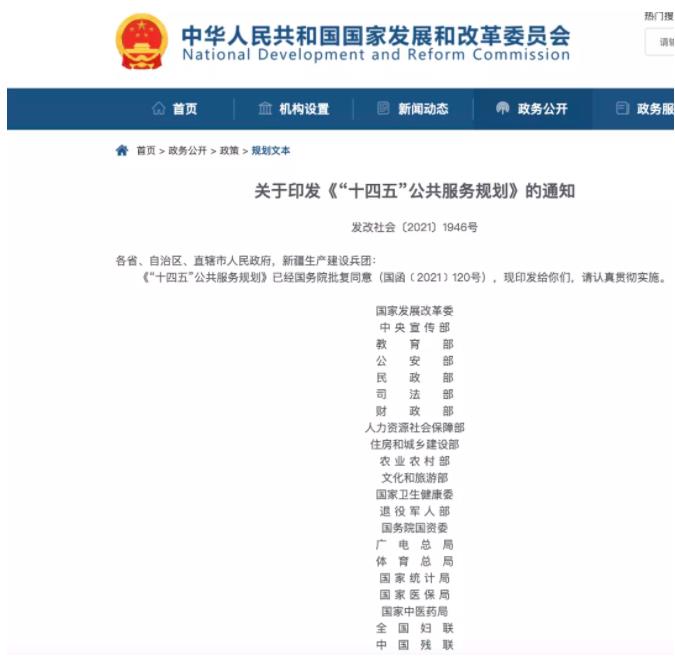2022年1月10日,国家发改委等21部门近日印发《“十四五”公共服务规划》(以下简称《规划》)。《规划》明确,到2025年,公共服务制度体系更加完善,政府保障基本、社会多元参与、全民共建共享的公共服务供给格局基本形成,民生福祉达到新水平。基本公共服务均等化水平明显提高,普惠性非基本公共服务实现提质扩容,逐步实现幼有善育、学有优教、劳有厚得、病有良医、老有颐养、住有宜居、弱有众扶。生活服务高品质多样化升级。