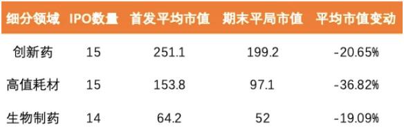 一位投资人曾在接受媒体采访时坦言,对于更多的破发特别严重的公司,一个共同的特点就是业绩是下滑的。在他看来,公司的基本面表现不如人意,是IPO破发的另一个关键。根据招商证券的三季报解读,总体上破发股所在行业的业绩增速放缓,企业三季报情况不及预期。与2021年A股最早破发的可孚医疗为例,其2021年上半年与第三季度营业收入同比下降10.50%与2.51%,归属母公司净利润分别下降20.97%与8.13% 当创新的故事红利接近尾声,盈利能力,成为悬在医疗新股头上的达摩克里斯之剑。2021年IPO的医疗股中,创新药企(15笔)、高值耗材(15起)和生物制药(包括仿制药和原料药,14笔)是最热门的赛道。其中,与上年相似,创新药IPO项目的平均市值仍然最高,其次是以血管介入、骨科耗材为代表的的高值耗材IPO。平均市值仅为创新药1/4、高值耗材1/2的生物制药类企业IPO数量,在2021年异军突起,并且市值变动水平略高于平均(-24.75%)。