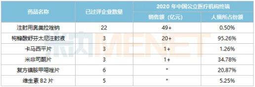有6个产品目前已过评企业数量超过3家,人福医药均按补充申请过评。注射用奥美拉唑钠是个超40亿的大品种,已过评企业数量超过20家,集采竞争压力山大,人福医药所占的市场份额不到1%;复方磺胺甲噁唑片以及维生素B2片目前已过评企业数量也达到了6家、5家,人福医药是复方磺胺甲噁唑片的TOP2企业,而维生素B2片所占份额并不高。