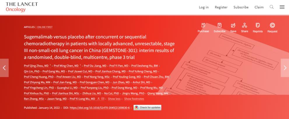 据了解,发表于《柳叶刀-肿瘤学》上的文章分别报告了GEMSTONE-301研究与GEMSTONE-302研究的成果。