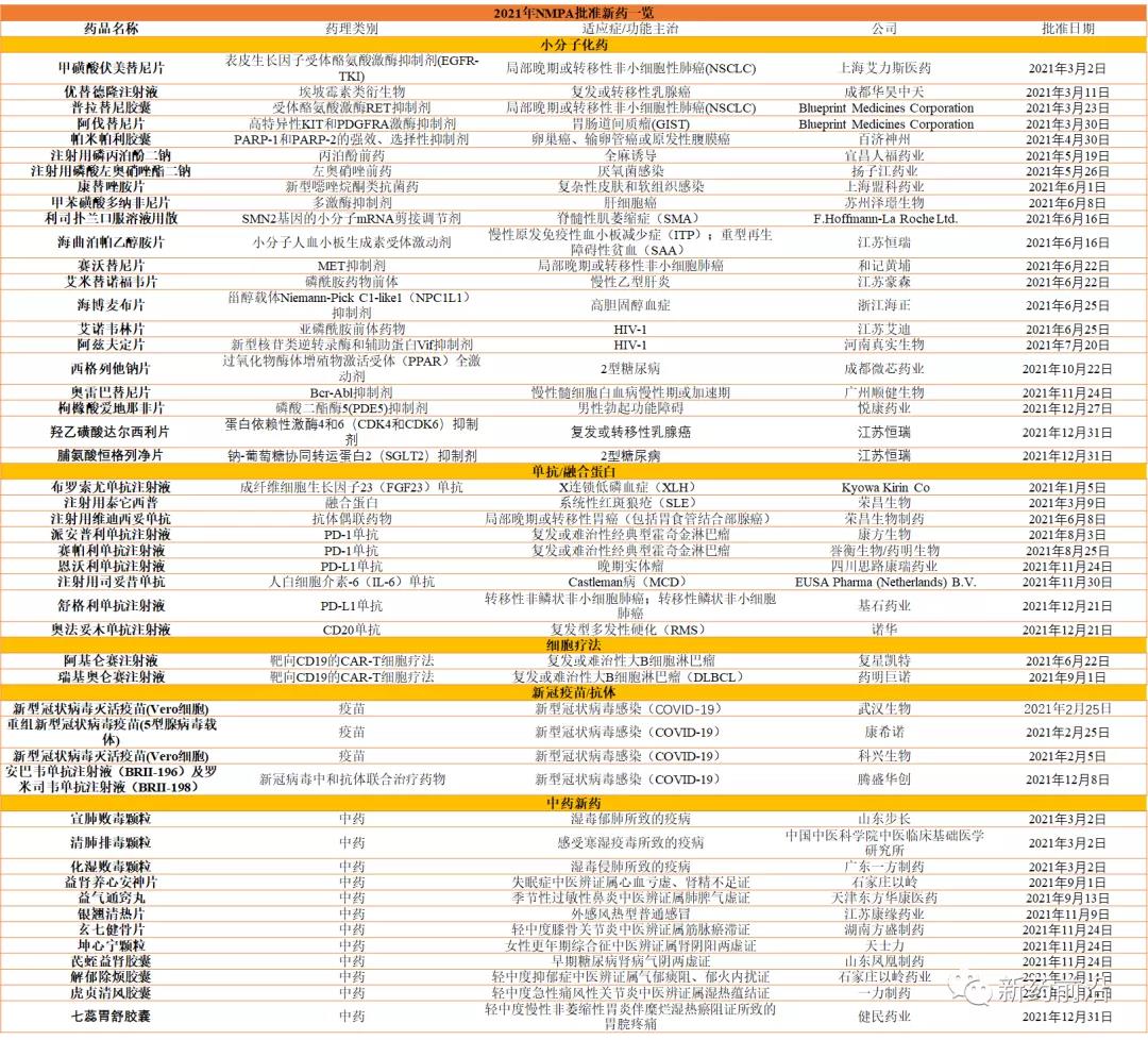 据NMPA或企业公告,2021年有48款新药获得批准上市,包括小分子化药21款,单抗/蛋白9款,细胞疗法2款,疫苗4款,中药12款。