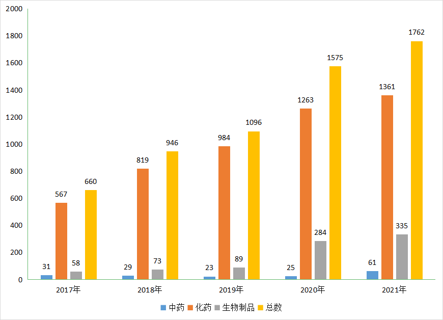 根据药智注册与受理数据库最新统计,2021年CDE共承办江苏省新的药品注册申请以受理号计有1762个(以受理号计,下同)其中化药1361个,中药61个,生物制品335个,年度受理总量较2020年增加了187个,占全国的受理总量比重的15.2 %;2017-2021年江苏省药品注册申请受理情况详见图1。