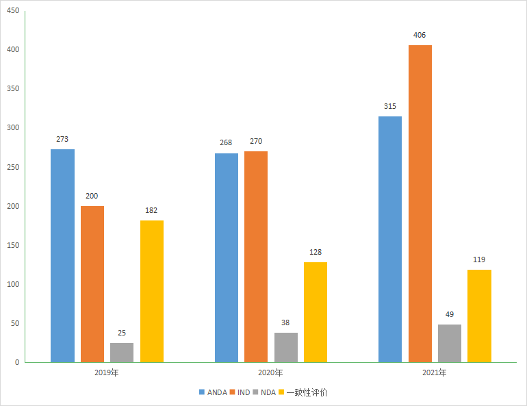 图6 2019-2021年江苏省化学药IND申请、NDA、ANDA和一致性评价注册申请受理情况