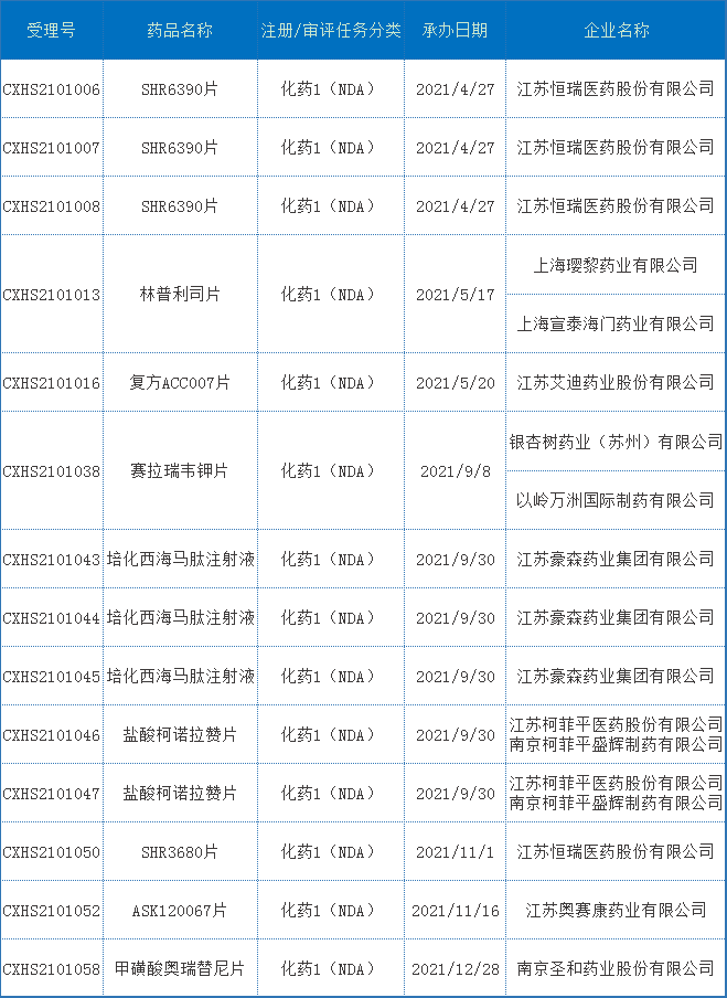表2 2021年江苏省化药1类NDA申报受理情况