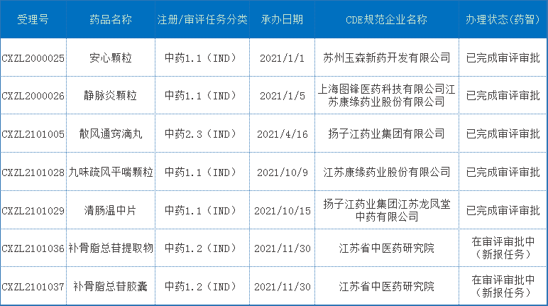 2021年CDE承办的江苏省中药注册申请以受理号计共有61个,其中新药申请7个,均为IND申请,补充申请54个;2021年江苏省中药新药申报受理情况详见表4: