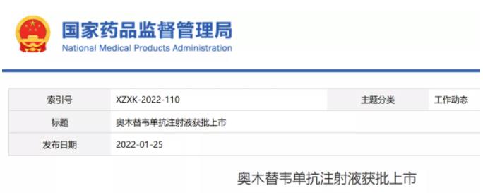 [1] 奥木替韦单抗注射液获批上市 . Retrieved Jan,25,2022,from https://www.nmpa.gov.cn/yaowen/ypjgyw/20220125123929136.html