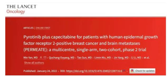 [1] Yan M, Ouyang Q, Sun T, et al. Pyrotinib plus capecitabine for patients with human epidermal growth factor receptor 2-positive breast cancer and brain metastases (PERMEATE): a multicentre, single-arm, two-cohort,phase 2 trial. Lancet Oncol 2022; published online Jan 24. https://doi.org/10.1016/S1470-2045(21)00716-6
