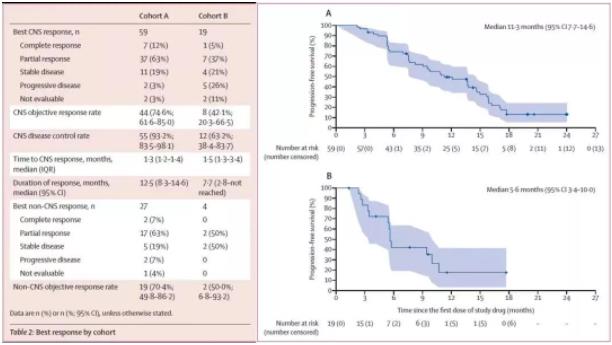 图:主要终点CNS-ORR(队列A 74.6%,队列B 42.1%)和次要终点PFS(队列A 11.3m,队列B 5.6m)结果