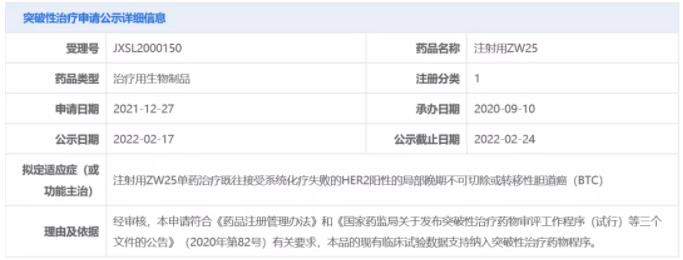 在美国,FDA曾授予ZW25治疗胆道癌、胃癌、卵巢癌的孤儿药资格,一线治疗胃食管腺癌和单药治疗难治性胆道癌的快速通道资格,以及治疗经治胆道癌的突破性疗法认定。其中,突破性疗法认定的授予是基于ZW25在1期试验中治疗胆道癌患者产生的数据。