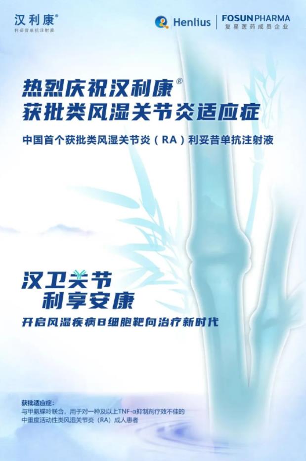 " 在汉利康®上市三周年之际,其新适应症类风湿关节炎正式获批,可喜可贺。复星医药将充分借助在既往风湿治疗领域的成功经验,为患者提供更便捷、更可及的治疗新方案。"