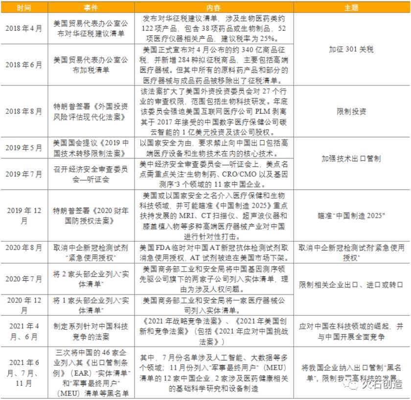 三年来,美国先后从层面加强对中国的打压,保持其在生物技术领域的领先地位。限制中国在美生物科技研发投资、对三百多项生物医药领域产品加征关税、禁止向中国出口生物技术、将生物技术头部企业列入“实体清单”、取消中企新冠检测试剂“紧急使用授权”等。