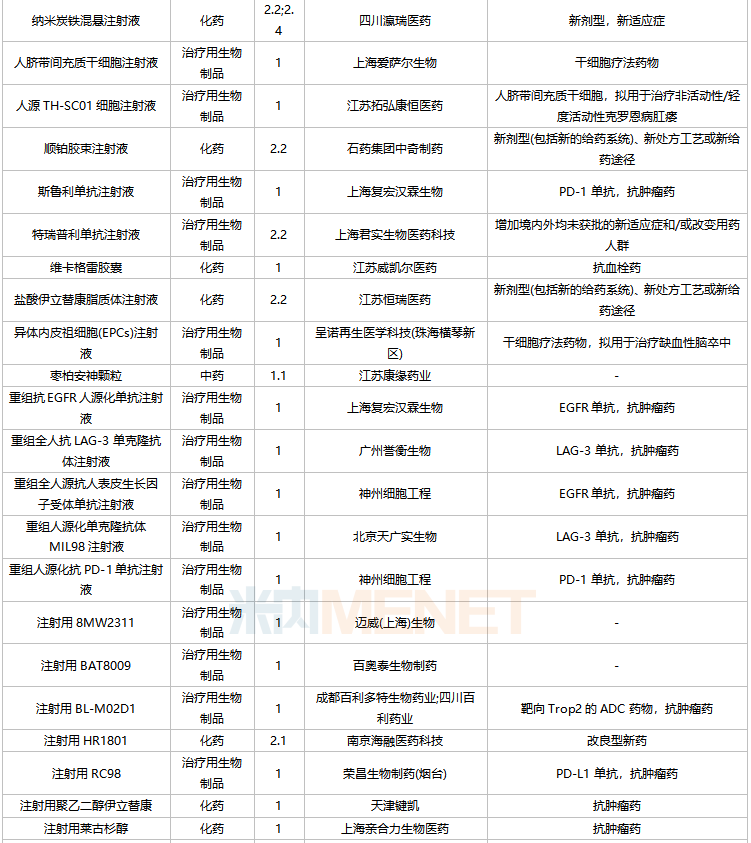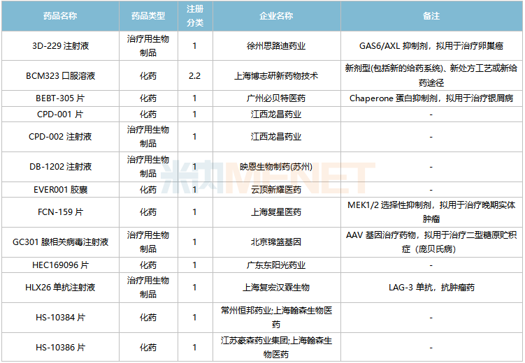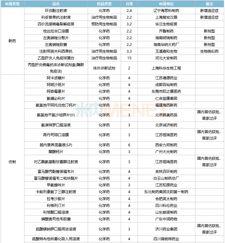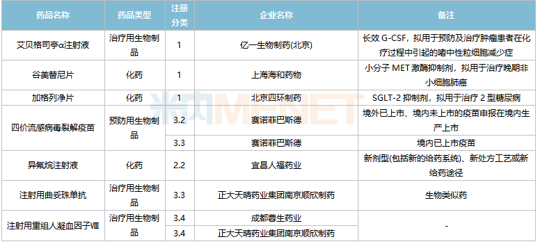 亿一生物制药(北京)的艾贝格司亭α注射液、上海海和药物的谷美替尼片、北京四环制药的加格列净片等3个1类新药为首次申报上市。