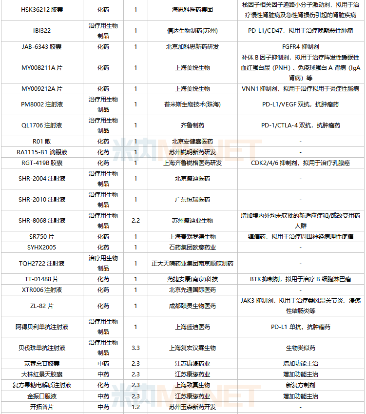 数据来源:米内网MED2.0药品审评数据库、CDE、NMPA;相关统计字段按药品名称统计,时间截至2022年2月28日;药物作用靶点以及适应症整理自公开资料。