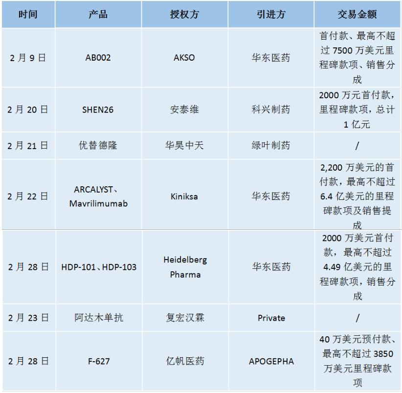 其中,华东医药共通过3起license in交易引进5款创新产品,涵盖抗肿瘤、自身免疫疾病领域,交易金额12.1亿美元(几乎是本月交易的总额)。华东医药此举意在快速加强管线布局。