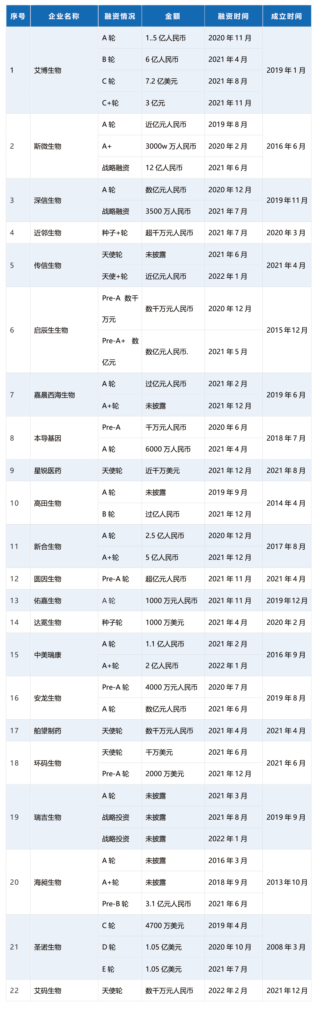 2021-2022年初,我国有22家核酸药物企业完成融资(详细见下表),mRNA领域的头部企业,如斯微生物、艾博生物、新合生物、启辰生生物等都先后完成了新一轮融资。特别是艾博生物超7亿美元的C轮融资更是刷新了国内生物医药领域的融资记录,并且短期内可能很难被超越。2021年,传信生物、星锐医药、圆因生物、舶望制药、环码生物、艾码生物等6家新企业成立并成功获得首轮融资。2022年mRNA赛道可能还会是资本关注的重点赛道之一。