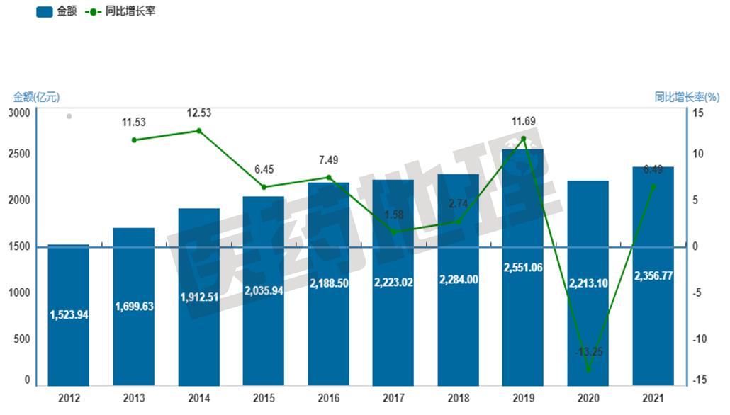 图1 样本医院市场历年销售增长分析(2012-2021年)