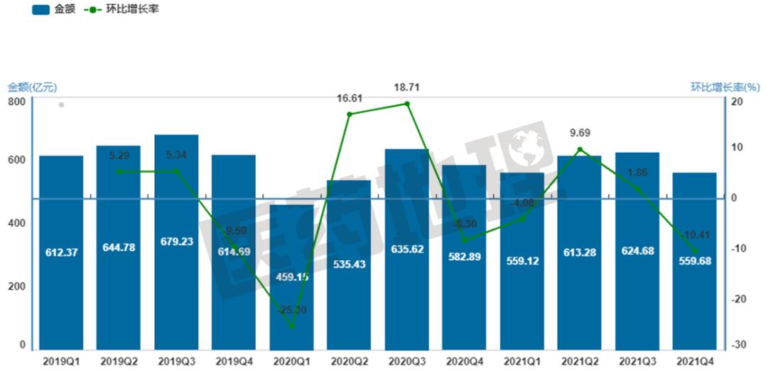 将2019-2021年样本医院销售数据细分到季度,可以看到2021年Q1和Q3季度环比增长低于往年同期(见图2)。2021年Q1季度,在2020年Q4季节性回调的基础上,继续下行,环比增长-4.08%,说明2021年开年第一季度的销售增长就较为乏力。Q2季度回弹,增长率冲高至9.69%,Q3季度为全年最为反常的销售数据,环比增长仅1.86%,往年Q3季度平均增长率可达3%-4%,这可能是Q2季度基数较高的原因。Q4季节性回调,环比增长-10.41%。