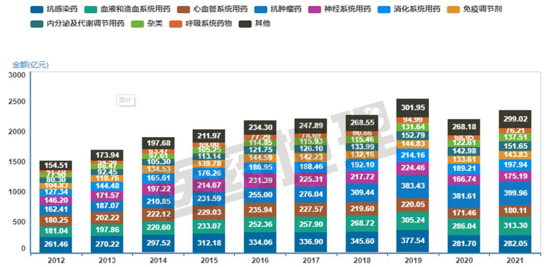 抗感染药在2012年是占比最高的治疗大类,到2021年时下降至11.97%,占比降至第四。抗感染药多为抗生素类、抗病毒药和抗菌药,该治疗大类的占比下降,一方面说明国家基础卫生条件改善,疫苗接种带来的全民免疫效率提高,人们接触各种病原体的概率下降,抵抗力提高;另一方面也说明临床用药习惯的改善。2012年8月,国家卫计委发布实施《抗菌药物临床应用管理办法》,该办法被称为“史上最严限抗令”,将抗菌药物进行三级管理,明确规定了不同等级医生的开药权限。可以看到法案实施十年间,伴随着医生和患者合理使用抗生素意识的提高,抗感染药的滥用得到了有效控制。