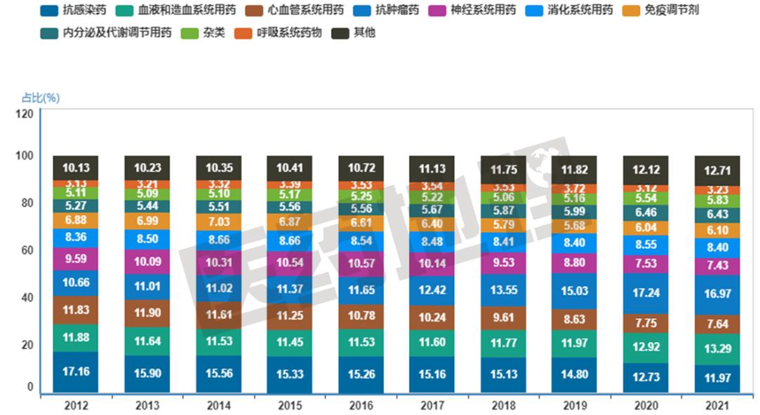 图4 样本医院市场各治疗大类历年销售占比分析(2012-2021年)