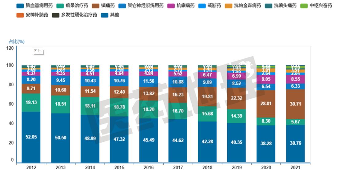图5 神经系统用药各小类历年销售占比分析(2012-2021年)
