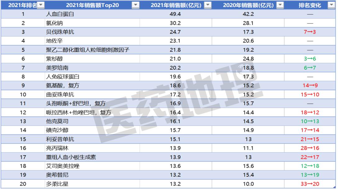 基于2021年全年样本医院销售数据,共有32种药品销售额破10亿元大关,7种药品突破20亿元大关,分别是人血白蛋白、氯化钠、贝伐珠单抗、地佐辛、聚乙二醇化重组人粒细胞刺激因子、紫杉醇和美罗培南(见图6)。一叶知秋,我们以销售额排名前十的药物单品进行分析,这些Top单品是对目前热门治疗领域和临床用药习惯的再次印证。人血白蛋白、氯化钠、聚乙二醇化重组人粒细胞刺激因子、人免疫球蛋白和氨基酸5种药品,具有体液平衡和基础治疗作用,在多种疾病领域都可以应用。剩下的5种Top10药品,3种是是抗肿瘤药(贝伐珠单抗、紫杉醇、曲妥珠单抗),再次印证了抗肿瘤市场的庞大。美罗培南是广谱抗菌药,而地佐辛则是一种强效阿片类镇痛剂。