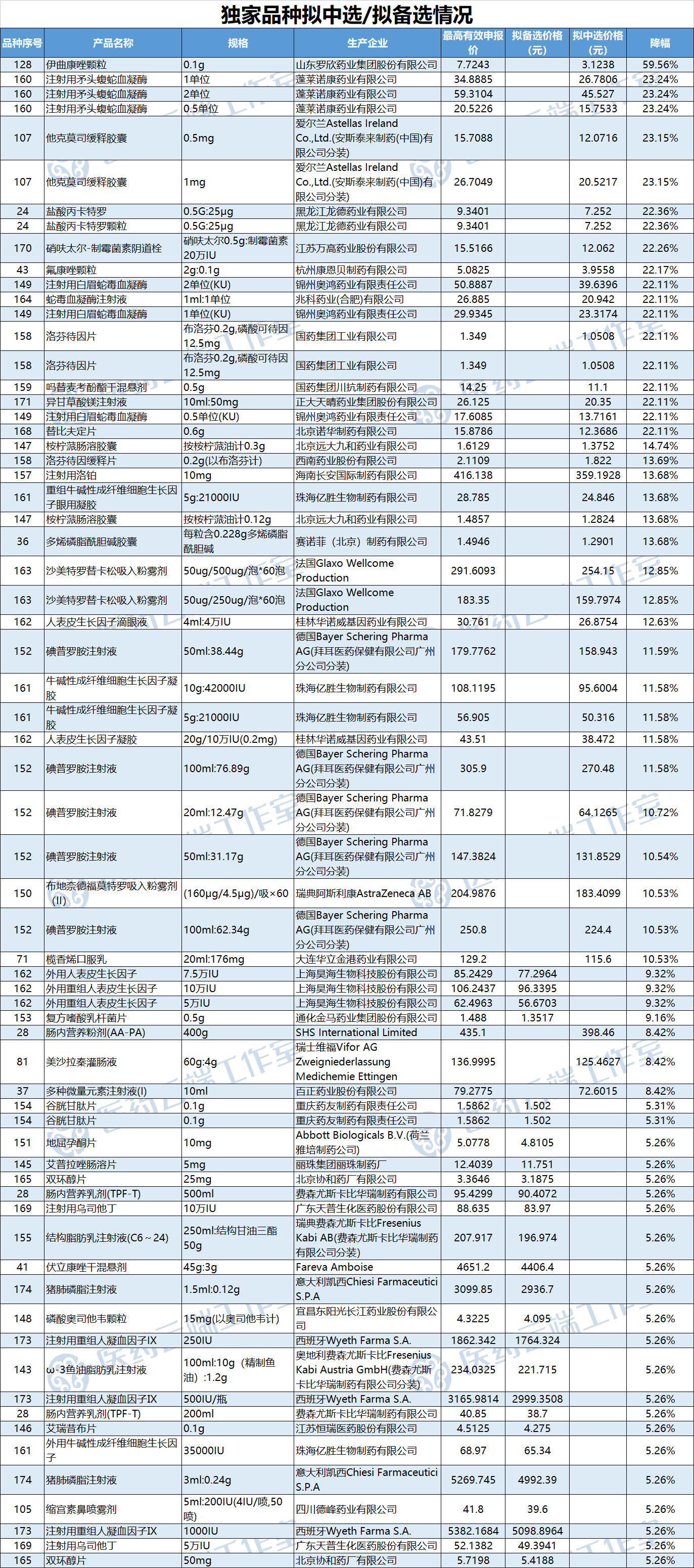 注:因各企业最低价并未公开,本文所有涉及降幅均为与最高有效申报价对比,仅作为分析参考,并非企业最终降幅,谢谢