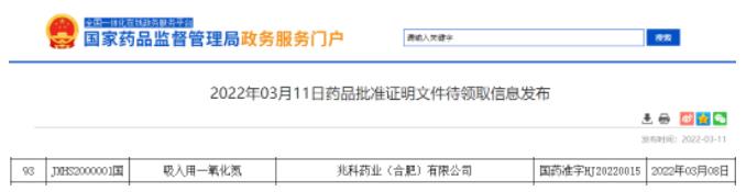 3 月 11 日,NMPA 官网发布批件,兆科药业 5.1 类新药「吸入用一氧化氮」获批上市。