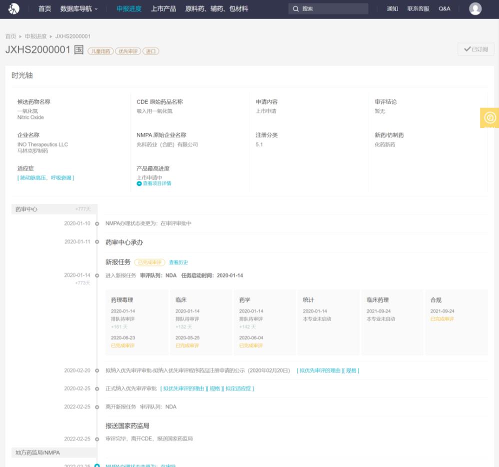 吸入式一氧化氮是兆科药业旗下的重要产品之一,据 Insight 数据库,2020 年 1 月该药在国内报产,成为国内首个申请上市的吸入用气体制剂药品,随后该上市申请被 CDE 以「罕见病和儿童用药品」为由纳入优先审评。