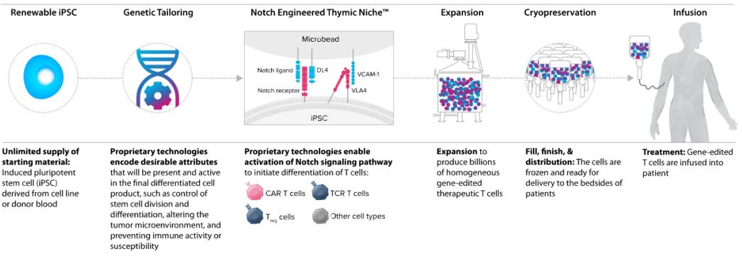 所以Notch的方法是用可再生的细胞来源来生产免疫细胞。我们专有的技术平台能从任意来源的多能干细胞中获得均一的T细胞。这些细胞不依赖于任何患者,能“放在架子上”,等待治疗病患。