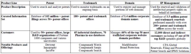 知识产权部门包括“专利产品线(PPL)”、“商标产品线(TPL)”、“域产品线(DPL)”和“知识产权管理产品线(IPMPL)”。知名的Derwent,Compumark和CPA Global属于这个部分。