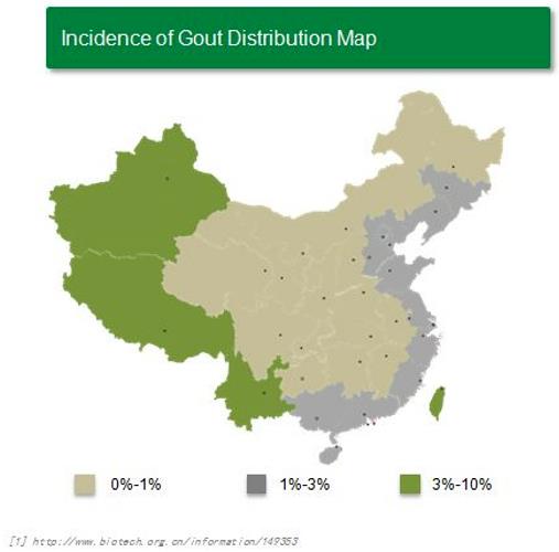痛风为全球常见疾病,据流行病学统计,欧洲及北美地区高尿酸血症患病率在2-18%之间,世界各地痛风总患病率介于0.13-15.3%之间,全球年发病率在0.20%-0.35%之间。其中,美国痛风患者患病率约为3.9%(据此估算,美国大约有830万患者)。在2017年,我国高尿酸血症患病率为13.0%,其中男性为18.5%,女性为8.0%。我国痛风的整体患病率在1%-5%左右,统计偏差是由于抽样地点不同样本差异带来的,目前尚无权威公布我国近期的痛风患者人数,根据不同文献,近年来各地痛风患病率抽查结果如下图:内陆地区:1%(四川,河北等);沿海地区:3%(广东、山东沿海、香港、台湾等地);少数民族地区:最大可达10%(台湾高山族、藏族等)。