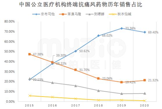 ▲图9 中国公立医疗机构终端抗痛风药物历年市场份额占比 (美柏医健整理,数据来源:PBD)