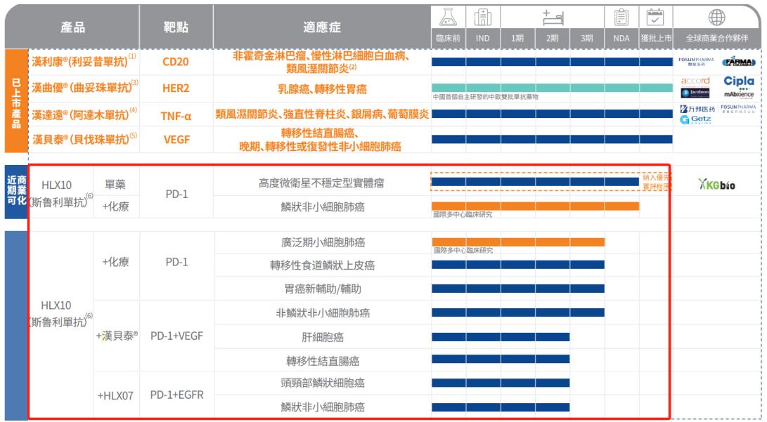 在管线中,复宏汉霖的PD-1产品斯鲁利单抗(H药)在非鳞状非小细胞肺癌、肝细胞癌及转移性结直肠癌均有探索,且均已处于临床Ⅱ/Ⅲ期的关键期。