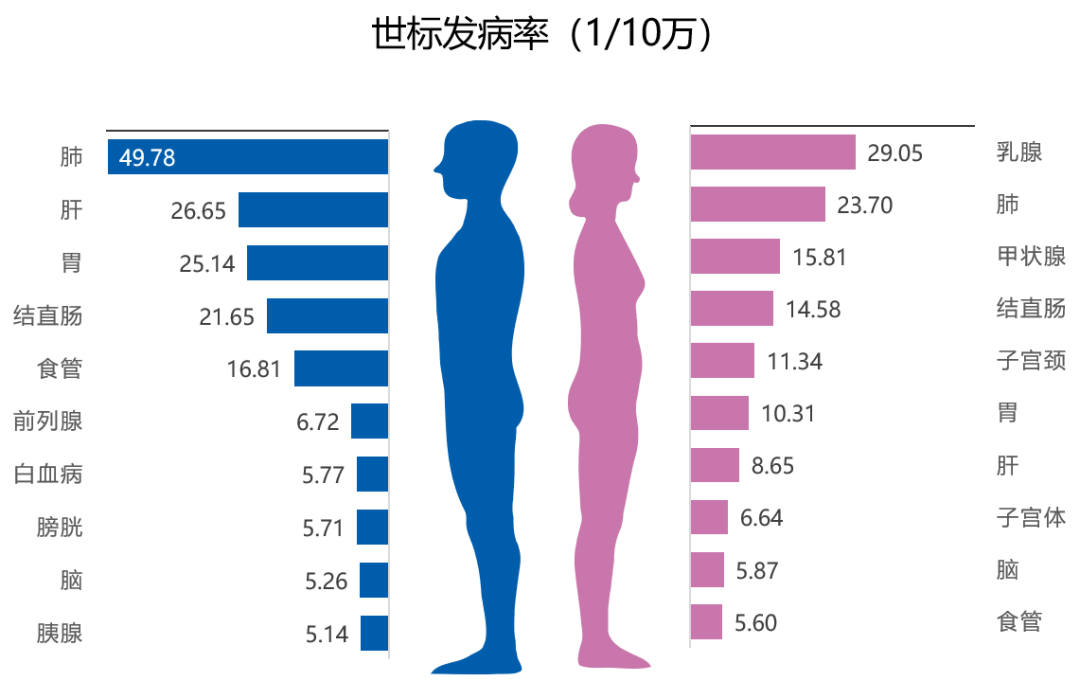 发病首位:男性为肺癌,女性为乳腺癌;