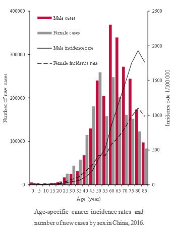 2020年中国新发癌症病例457万例,其中男性248万例,女性209万例,2020年中国癌症死亡病例300万例,其中男性182万例,女性118万例。