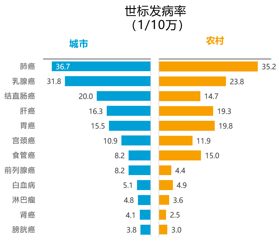 城市高于农村: 肺癌、结直肠癌、乳腺癌、前列腺癌