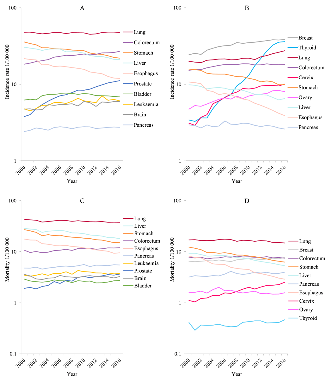 男性和女性部分癌症2000—2016年间发病率和死亡率变化趋势。A:男性发病率;B:女性发病率;C:男性死亡率;D:女性死亡率。