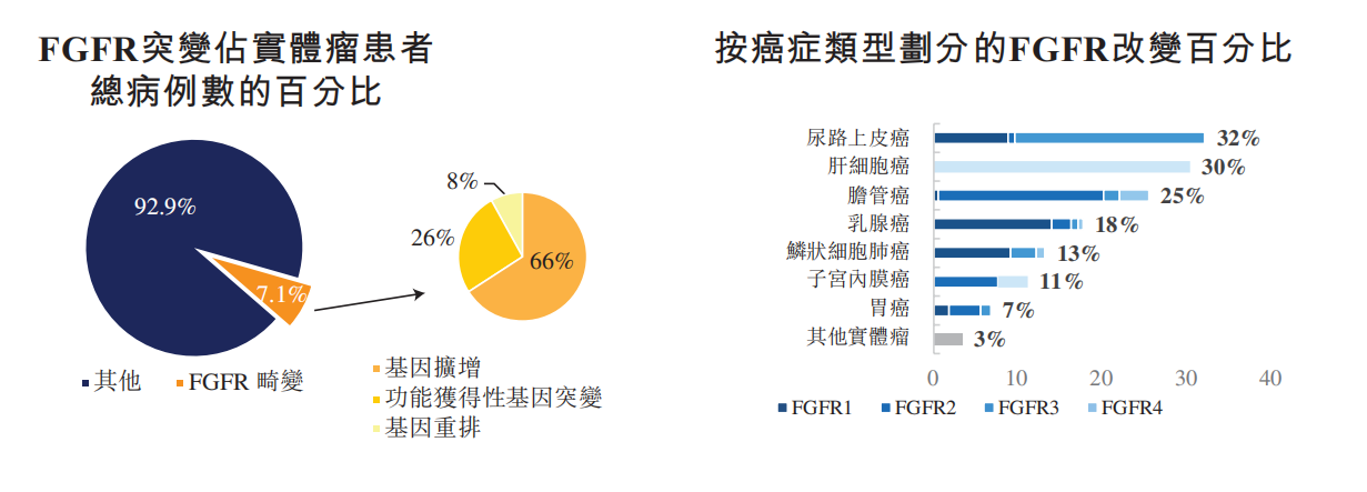 FGFR信号调节广泛的基本生物过程,包括组织发育及组织再生,其功能障碍被视为癌症发展的原因之一。FGFR畸变在实体瘤患者中普遍存在,约占全部实体瘤患者的7.1%。