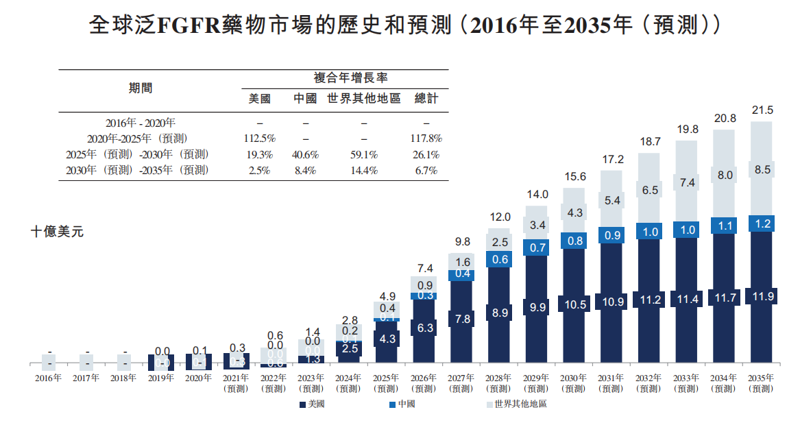 图4. 全球泛FGFR抑制剂市场的历史和预测,来源:和誉招股书