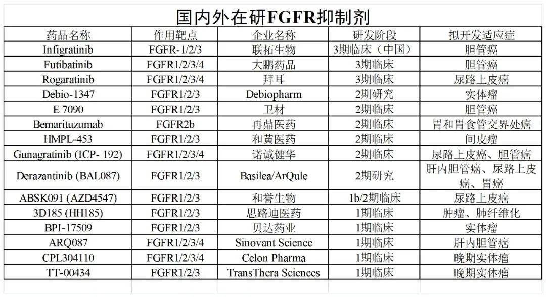 国际上进展较快的项目主要有大鹏制药的Futibatinib、拜耳的Rogaratinib。