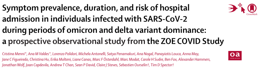 [1]Symptom prevalence, duration, and risk of hospital admission in individuals infected with SARS-CoV-2 during periods of omicron and delta variant dominance: a prospective observational study from the ZOE COVID Study DOI:https://doi.org/10.1016/S0140-6736(22)00327-0