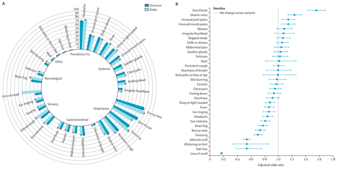 二,喉咙痛、声音嘶哑的情况明显变多了,奥密克戎患者出现喉咙痛、声音嘶哑的风险和德尔塔感染者相比,分别提高了55%(OR 1·55, 95% CI 1·43–1·69 [p<0·001])和24%(1·24, 1·14–1·34 [p<0·001])。