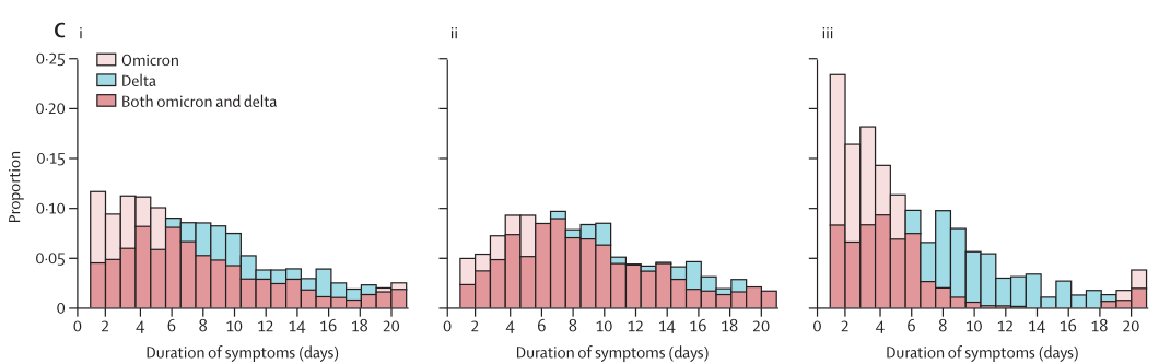 图注:整体上、接种了2针疫苗和接种了3针疫苗的德尔塔和奥密克戎感染者症状持续时间