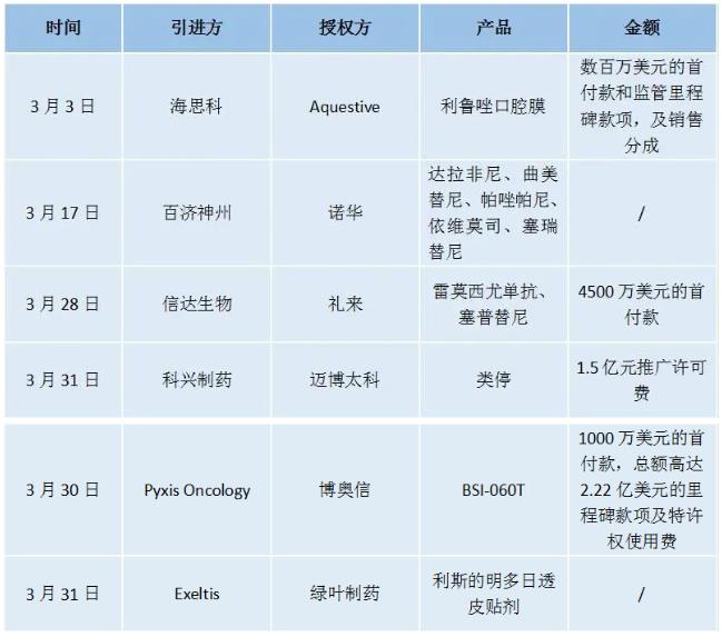 2022年3月,据不完全统计,国内药企共发生4起License in交易及2起License out交易,共披露的交易金额超19亿元。